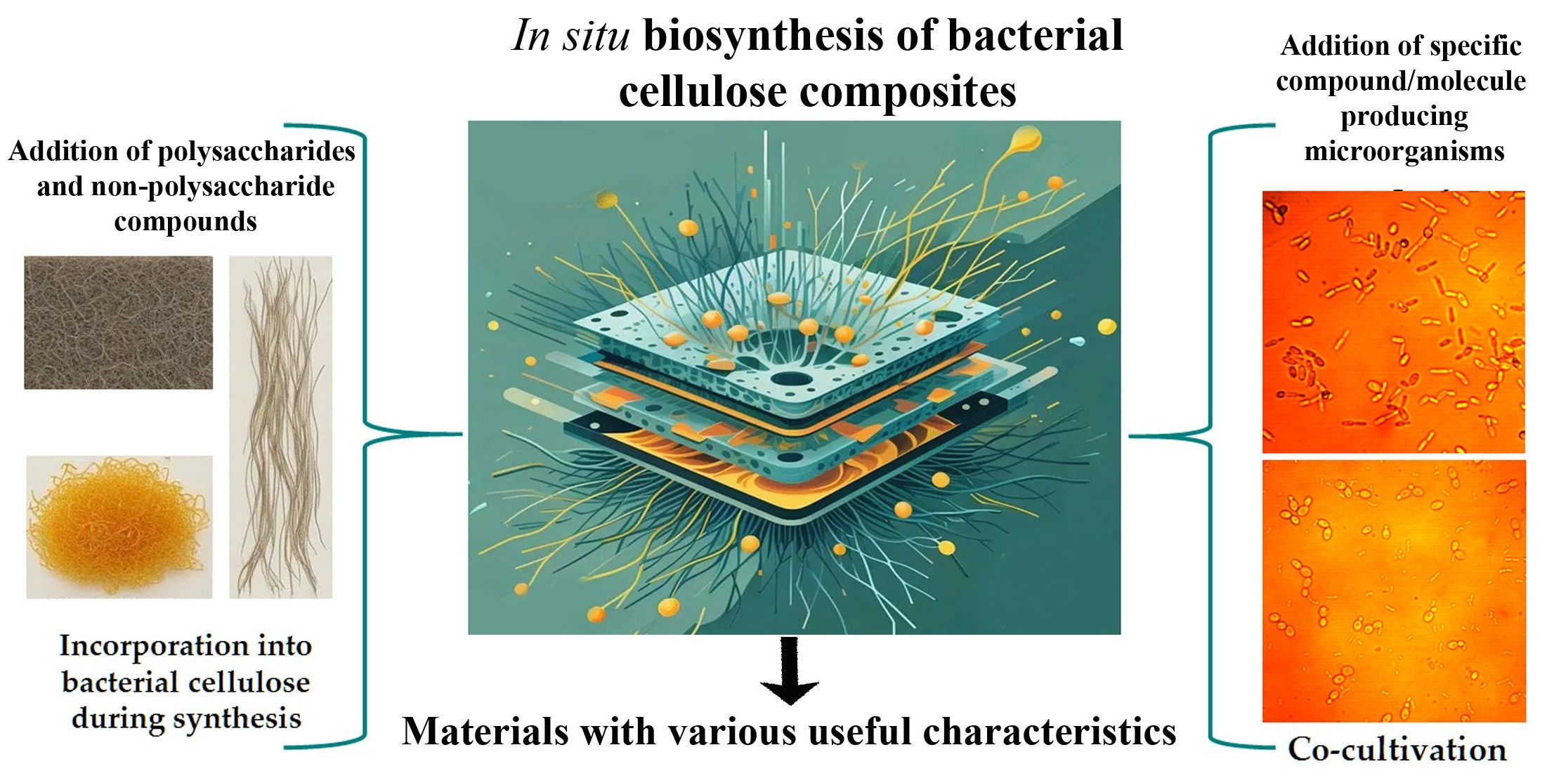 2.3. Production of BC Composites Through Co-Cultivation/Addition of Different Microorganisms Producing Specific Compounds