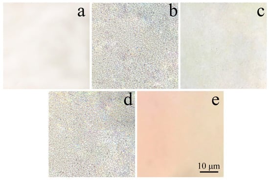 Optical microscopy images of solutions of cellulose (a), mixed solutions with the ratio of cellulose/PAN components of 70/30 (b), 50/50 (c), 30/70 (d) and PAN (e) in NMMO at 110 °C.