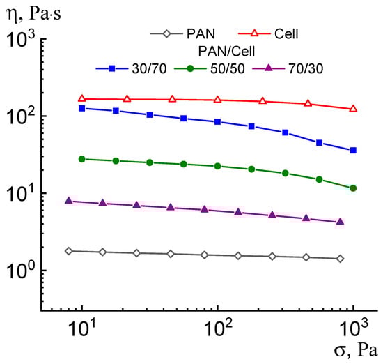 The observed morphology of the solutions provides a deeper understanding of the rheological behavior of the solutions. Figure 2 shows the dependences of viscosity on shear stress for PAN, cellulose, and their mixed solutions in NMMO.