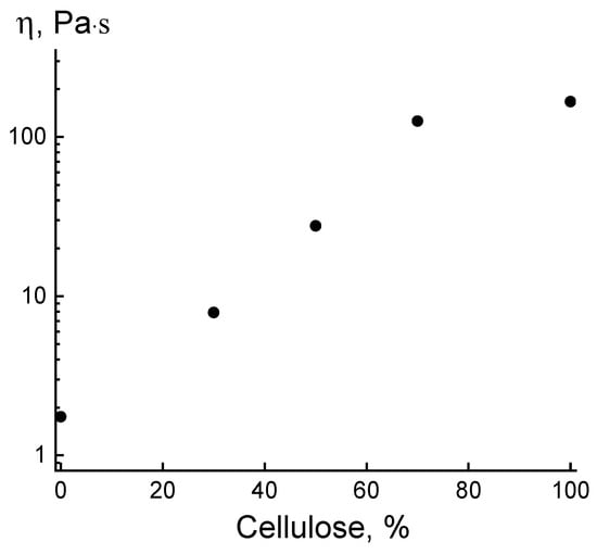 Based on the results of rheological measurements of the mixtures, a concentration dependence was plotted reflecting the influence of the PAN/cellulose component ratio in the NMMO solution on the viscosity (Figure 3). The concentration dependence is common for systems with low- and high-viscosity components []: when the fraction of the low-viscosity component increases, the mixture’s viscosity declines.