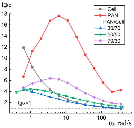 Thus, for the cellulose solution, predominantly viscous behavior (G″ > G′) of the system is observed in the low-frequency region. At frequencies above 200 rad/s, the elastic component exceeds the viscous one. For mixed solutions, the crossover (G″ = G′) is recorded only for the system with a cellulose content of 70%. For other systems, the loss modulus exceeds the storage modulus in the entire frequency region. The predominantly viscous behavior of the systems can be traced in the dependences of the tangent of the angle of mechanical losses (Figure 5). At low frequencies, tgα takes values above 1.