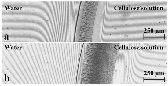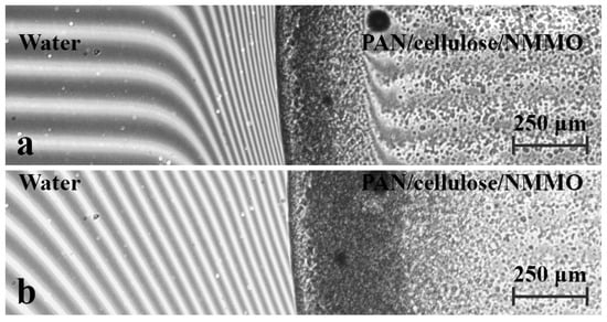 Interference pattern of the diffusion interaction zone of a 12% solution of a PAN/cellulose polymer mixture (50/50) in NMMO with water. The contact time of the components is 10 s (a) and 1 min (b).
