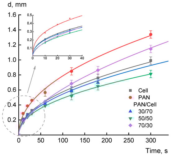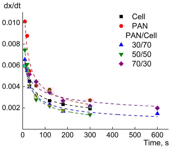 The translational mobility of the components in this case is limited by the viscosity of the solution. The lowest viscosity, according to rheological measurements, is recorded for the PAN solution. The diffusion process is most intense in the first minutes of contact, then a slowdown in diffusion processes is observed (Figure 14), which is associated with the gradual formation of a polymer gel zone. Despite the different nature of the polymers, the highest and lowest values are observed for cellulose solutions and systems with 50% PAN content. This is probably due to the step-by-step separation of polymer phases. First, a PAN solution with a viscosity lower than for a 12% PAN solution in NMMO is precipitated. Then, coagulation of the cellulose phase occurs.