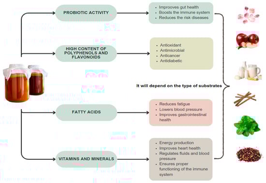 Not only are bioactive compounds present, but also water-soluble vitamins such as B1, B2, B6, B12, and fat-soluble vitamins like vitamins E, K, and A are produced [11]. Amino acids, biogenic amines, and pigments are also produced [17]. These vitamins support acetic bacteria in their metabolic processes. Minerals such as nickel, magnesium, iron, lead, zinc, chromium, copper, and zinc, like phenolic compounds, their presence depends on the symbiotic culture included and fermentation conditions [7]. Anions such as fluoride, bromide, iodide, phosphate, chloride, nitrate, or sulfate are also present [4].