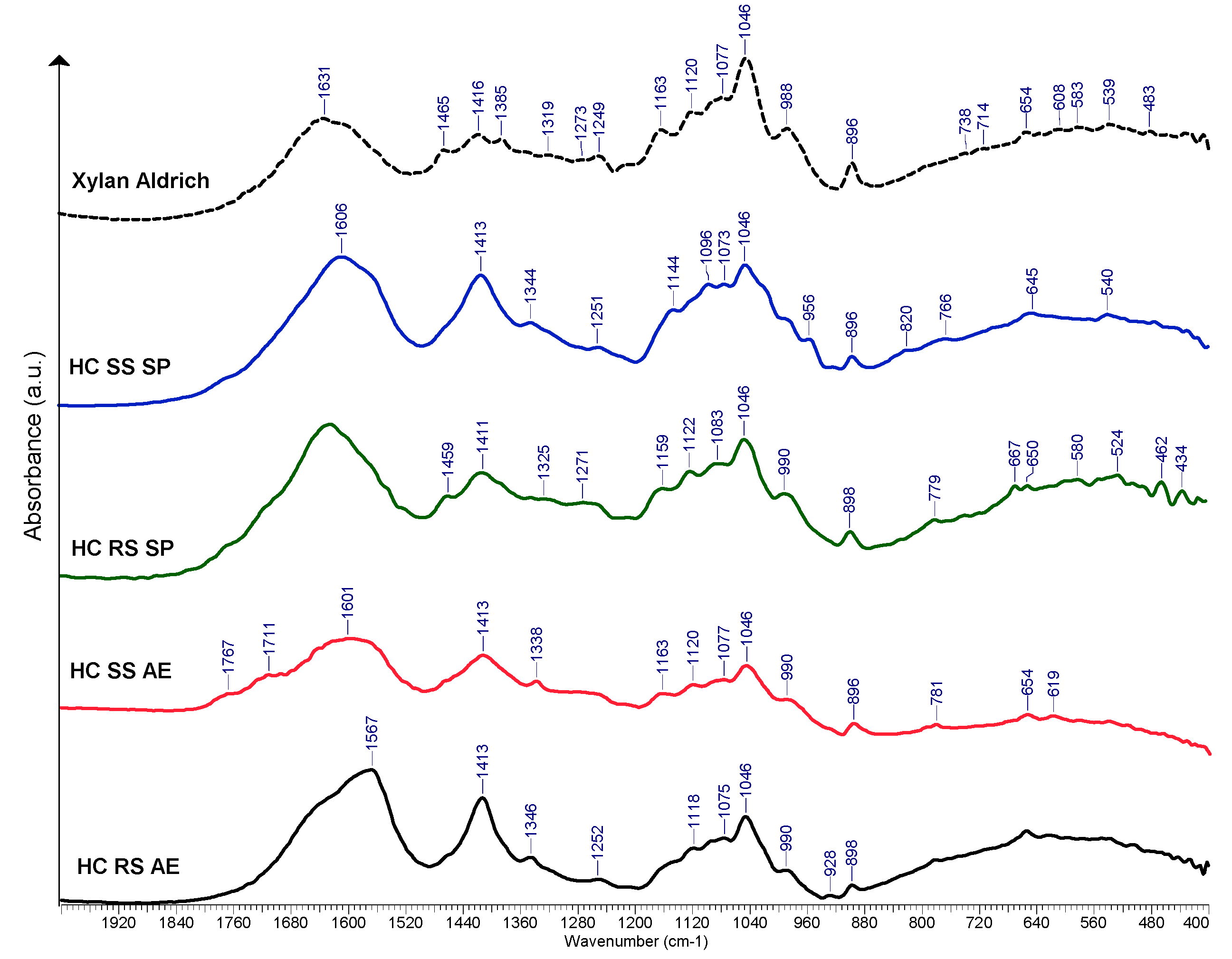 - Bands or shoulders at ~1270 cm−1 could be associated with the lignin residues, although no particular lignin peaks are visible at other wavenumber values such as 1510 or 1600 cm−1 [72];