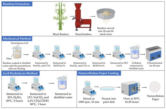 Bamboo particles sized 30 mesh and 60 mesh were immersed in distilled water overnight. Extraction of nanocellulose was carried out by soaking the bamboo powder in a 20%, 30%, and 45% H2SO4 solution at a ratio of 1:8 (w/w) and heating at 45 °C for 2 h for optimization. Upon experimental screening (pre-fabrication), the optimized concentration of H2SO4, i.e., 45%, for acid hydrolysis was used further for subsequent processes. Subsequently, the mixture was filtered and rinsed with distilled water until neutral. The process continued to the bleaching stage, where the bamboo was treated with a solution containing 12% NaClO2 and 2.4% CH3COOH with a volume ratio of 1:10 (w/w) and heated at 80 °C for 1 h. The bleaching process was carried out twice. Afterward, the mixture was filtered and rinsed with distilled water until neutral [25]. The nanocellulose suspensions with various concentrations similar to that in the mechanical method were then stirred at 1000 rpm for 1 h. The procedure for the fabrication of nanocellulose paper was also identical to that explained in Section 2.1 [25]. Overall, the nanocellulose extraction and fabrication processes using both mechanical and acid hydrolysis methods are schematically depicted in Figure 1.