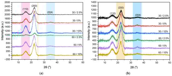 The X-ray diffraction (XRD) pattern indicates the crystal structure of bamboo nanocellulose extracted using both mechanical and acid hydrolysis methods. The XRD pattern for the mechanical method, as shown in Figure 3a, reveals maxima at 2θ of 16.13°, 22.30°, and 34.90°, while the acid hydrolysis method, depicted in Figure 3b, exhibits diffraction peaks at 2θ of 15.73°, 22.72°, and 35.27°. Both diffraction patterns correspond to JCPDS No. 00-050-22411, identified as the crystalline structure of cellulose type I [33]. This indicates that the differences in the extraction methods of bamboo nanocellulose do not alter its crystal structure [22]. Cellulose I has two polymorphic structures: triclinic (Iα) and monoclinic (Iβ). Cellulose Iα possesses Miller indices of (100), (010), (110), and (14), whereas cellulose Iβ has Miller indices of (10), (110), (200), and (004) [34]. In this study, the bamboo nanocellulose exhibited Miller indices of (110), (200), and (004), indicating a dominance of cellulose Iβ.