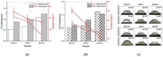 Correlation between the increase in hydroxyl groups (bar chart) and the contact angle (line plot) value of nanocellulose paper (a) 30 mesh and (b) 60 mesh; error bars represent the standard deviations of repetitive experiments (n = 3); (c) mean results of contact angle testing of nanocellulose paper using mechanical method and acid hydrolysis method.