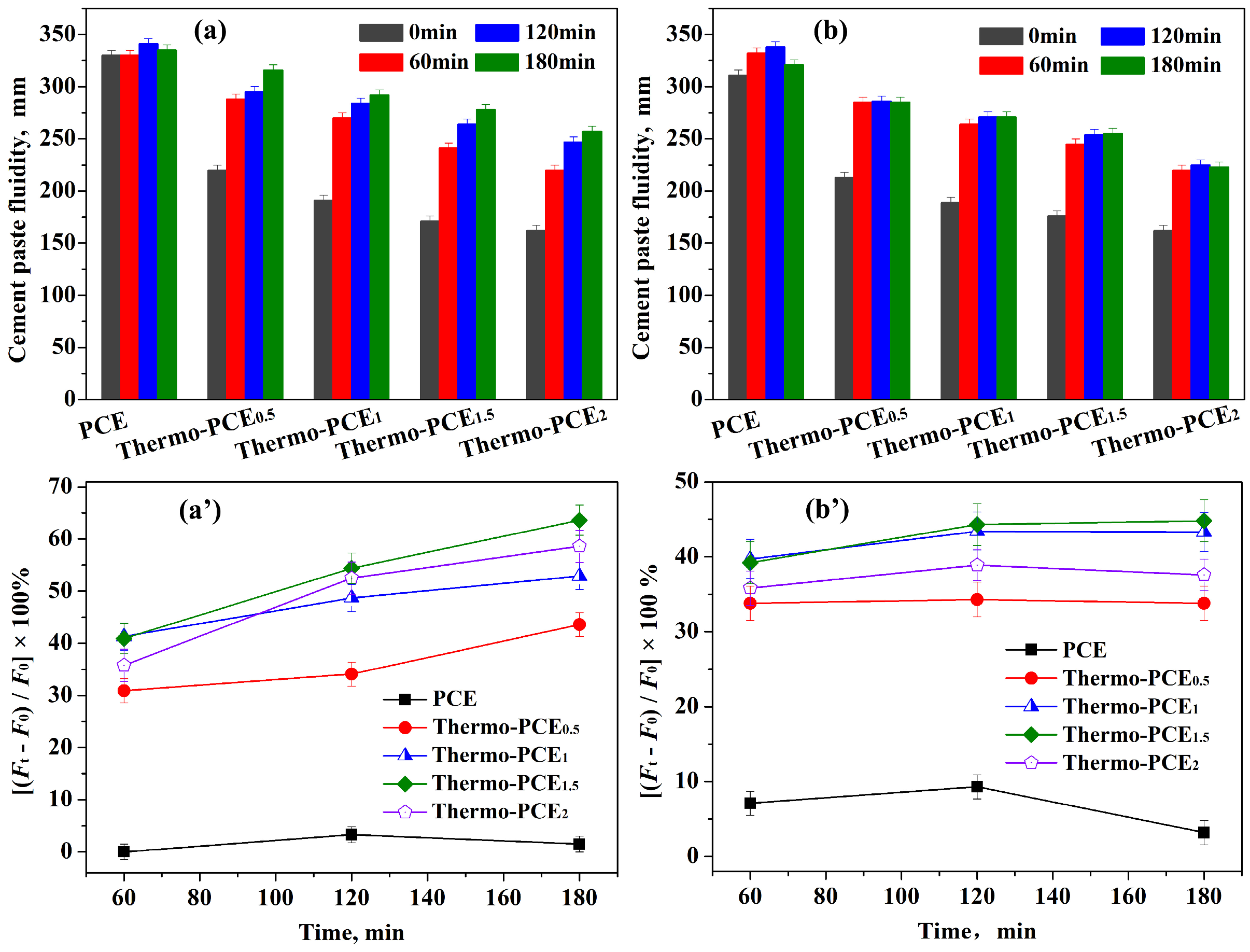 3.3. Dispersion Capacities of Thermo-PCEx in Cement Pastes