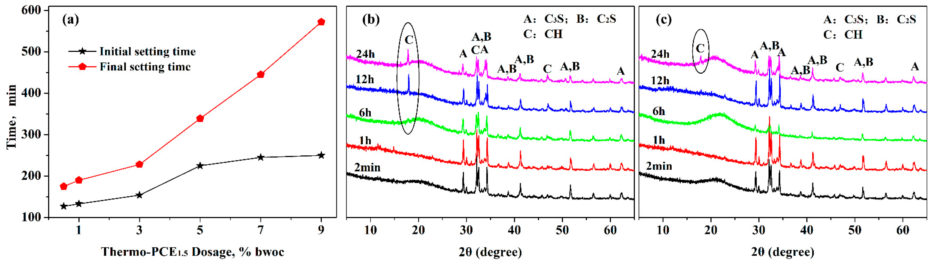 3.3.2. Effects of Thermo-PCE1.5 on Setting Time and Early Hydration Products