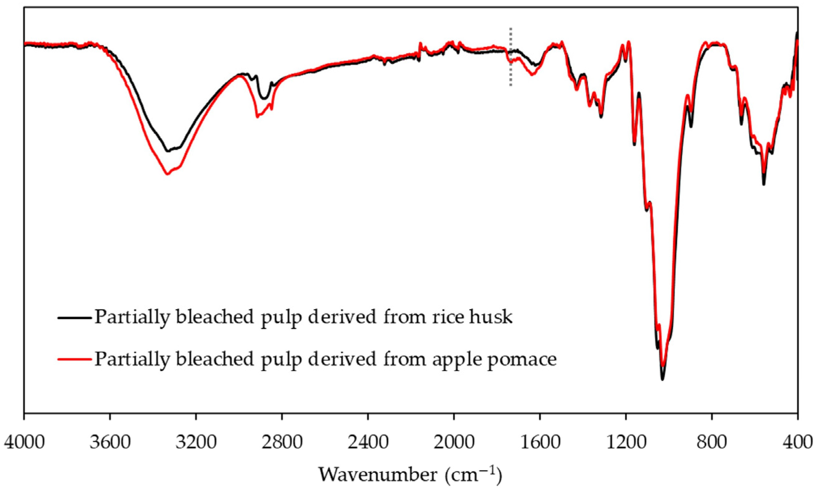 47]. These features indicate a higher residual lignin content than in rice husk pulp. The FTIR spectra of both partially bleached pulps display characteristic cellulose absorption bands. The bands at 1430 cm