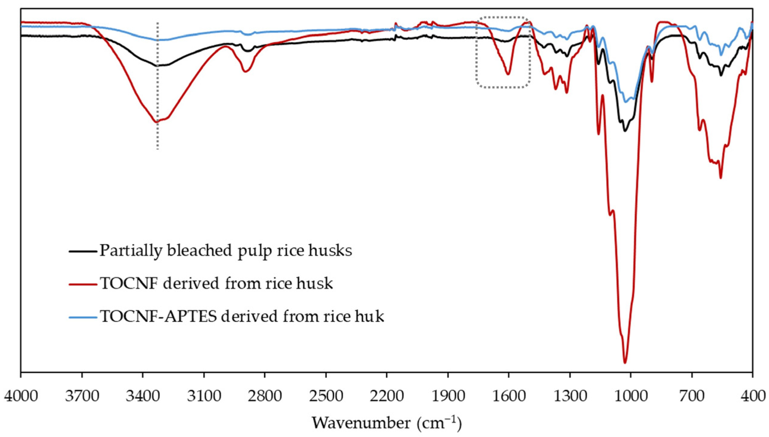 Figure 3). The TOCNF spectrum exhibited a distinct absorption band at around 1600 cm