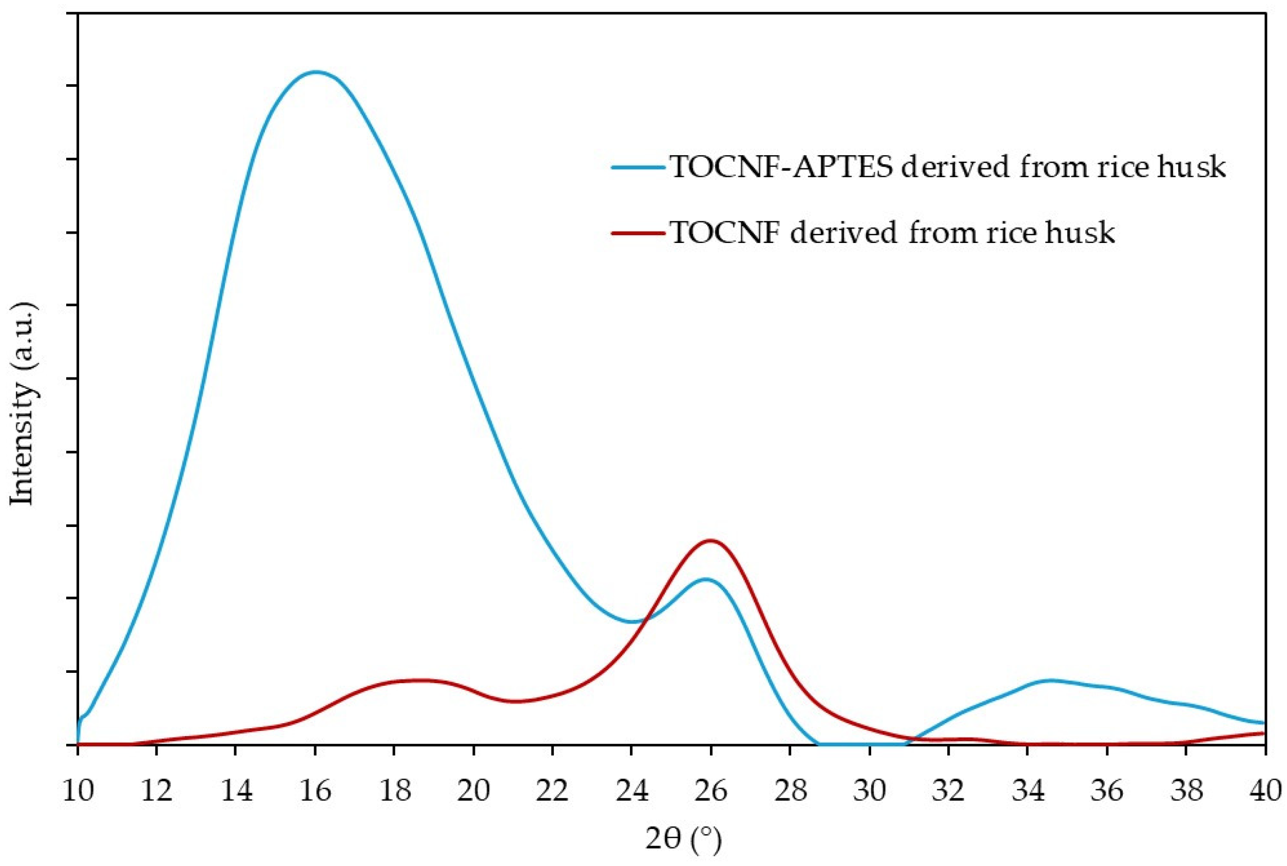 The X-ray diffractograms of the TOCNFs derived from rice husks before and after APTES modification are shown in