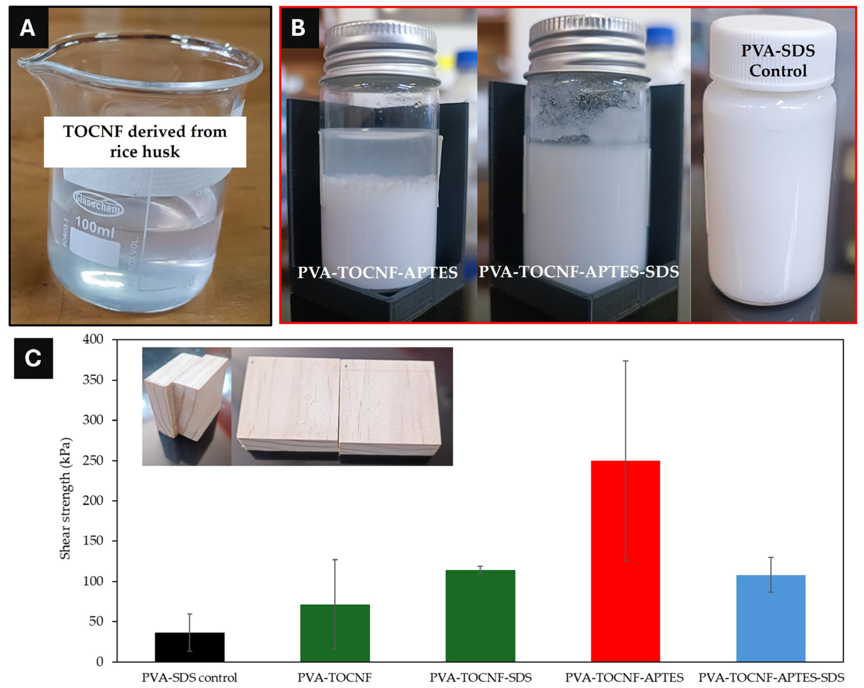 3.6. Adhesive Performance Produced from PVA-TOCNF-APTES