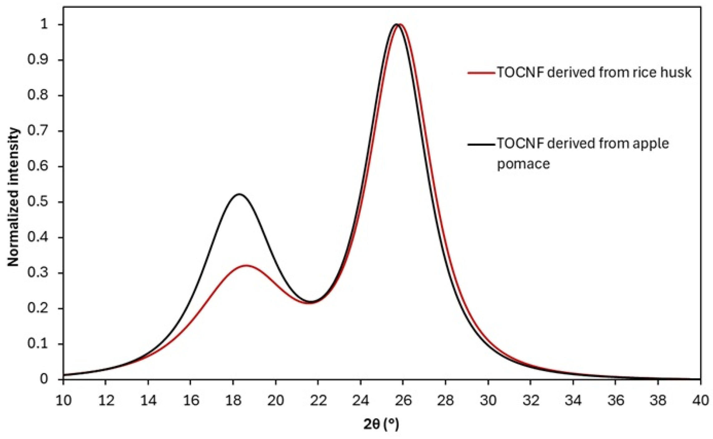 48]. The crystalline characteristics and X-ray diffractograms of the TOCNFs extracted from rice husk and apple pomace are depicted in