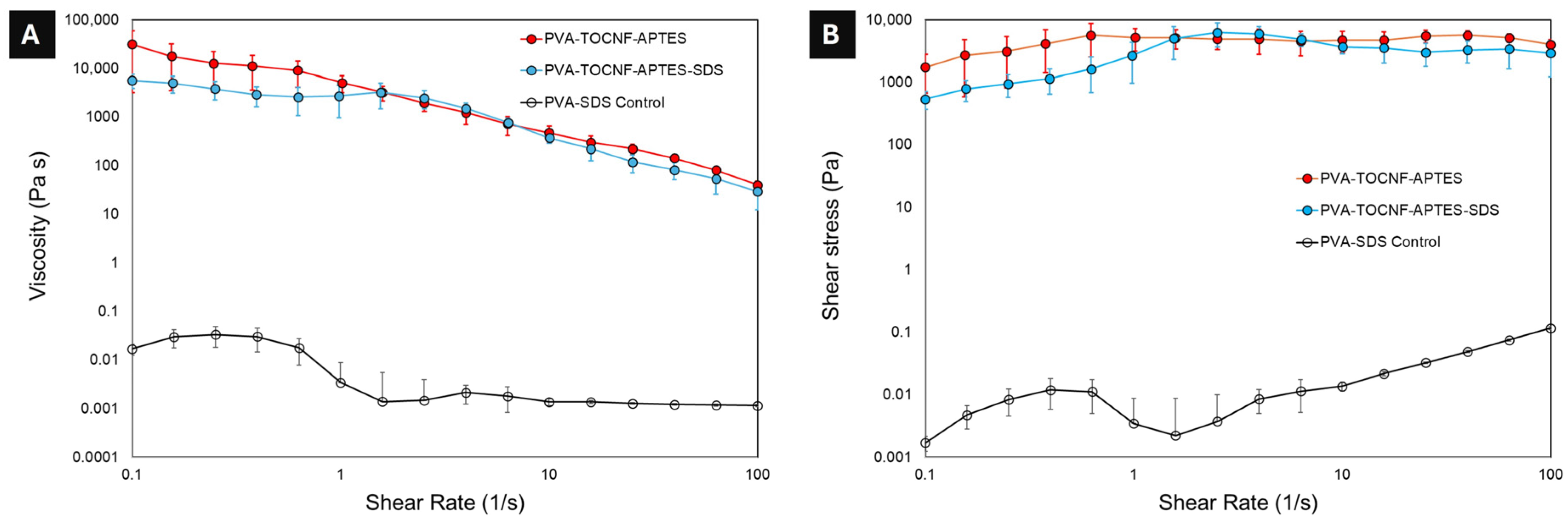 −1), the entanglement network broke, and the nanofibers tended to align with the shear directions, causing a decrease in viscosities with similar values for both PVA-TOCNF-APTES and PVA-TOCNF-APTES-SDS samples. This behavior can be attributed to the enhanced inter-fibrillar interactions facilitated by silane grafting, which involves hydrogen bonding and potential siloxane-mediated associations. These interactions effectively strengthen the CNF network and limit the mobility of the polymer chains.