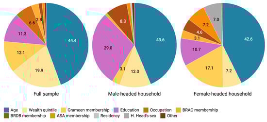 Figure 1 shows the relative importance of the predictor variables, in terms of their percentage contribution to the variance in the outcome variables (HA). Among the microcredit related variables, membership with Grameen bank was the most important predictor of HA, followed by BRAC, BRDB, and ASA. The relative importance of the predictor variables varied substantially between male- and female-headed households.