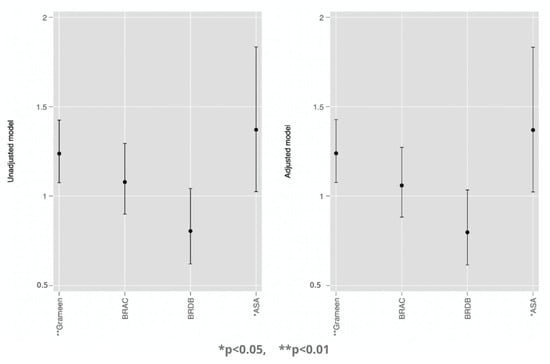 As shown in Table 2, Grameen Bank membership was positively associated with reporting HA in both male (OR = 1.16, 95%CI = 1.09, 1.23) and female-headed household (OR = 1.44, 95%CI = 1.13, 1.85). A positive association between microcredit membership and HA was also observed for BRAC (OR = 1.33, 95%CI = 1.20, 1.47) and BRDB (OR = 1.18, 95%CI = 1.09, 1.29), but in the male-headed households only.