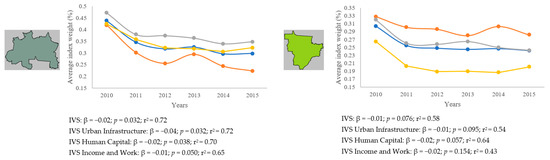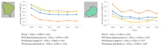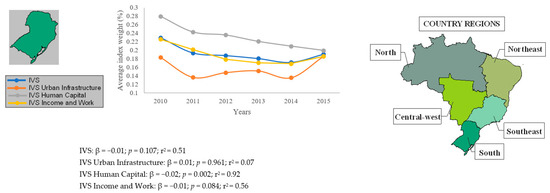 Only the Northern region had a significant decline in social vulnerability (IVS: β = −0.02, p = 0.032, r2 = 0.72, IVS urban infrastructure: β = −0.04, p = 0.032, r2 = 0.72, IVS human capital: β = −0.02, p = 0.038, r2 = 0.70). On the other hand, the Southeast and South regions presented a statistically significant reduction only for the IVS human capital indicator, β = −0.02, p = 0.021, r2 = 0.77 and β = −0.02, p = 0.002, r2 = 0.92, respectively (Figure 1).
