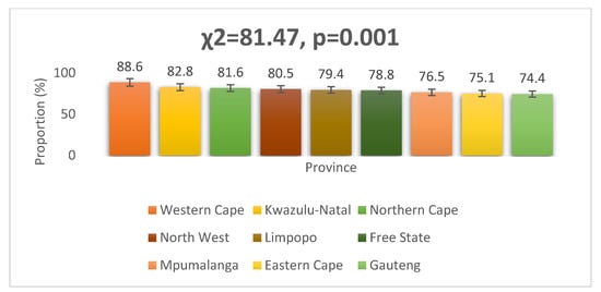 As shown in Figure 2, the prevalence of the Utilization of Antenatal care services among women of reproductive age in SA was statistically significantly highest in the province of Western Cape (88.6%), followed by Kwazulu-Natal (82.8%), Northern Cape (81.6%) and North West (80.5%) (χ2 = 81.47, p = 0.001).