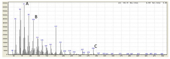 Mass chromatogram of sclareol obtained using GC-MS analysis in the full scan mode. The vertical axis shows the signal intensity, and the horizontal axis shows m/z. We analyzed (A) m/z 81, (B) m/z 109, and (C) m/z 290 in the GC-MS analysis as monitor ions.