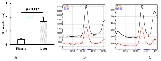 (A) Concentration of sclareol in plasma and liver homogenates 30 min after transdermal administration of sclareol in the sclareol-administered group. Values are presented as mean ± SE, n = 4. A paired t-test was performed using the SPSS 24.0 statistical software package. * p < 0.05. (B) Representative chromatograms of plasma concentrations of sclareol from the GC-MS analysis. (C) Representative chromatograms of sclareol in liver homogenates from the GC-MS analysis. We analyzed m/z 81, 109, and 290 in selected ion monitoring mode to quantify sclareol in plasma or liver homogenates (m/z 81 was used for quantification). The retention time of the sclareol standard product analyzed in the scan mode was 39.8 min.