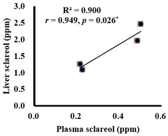 Pearson’s correlation coefficients were used to determine the presence of a correlation between the parameters of interindividual variability in sclareol biodistribution. As shown in Figure 4, a strong positive correlation was observed between the plasma sclareol concentration and liver homogenate sclareol concentration (r = 0.949, p = 0.026).