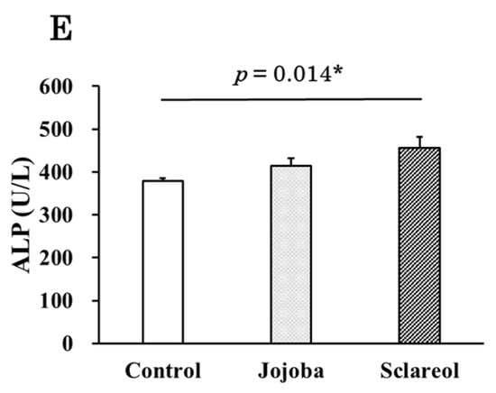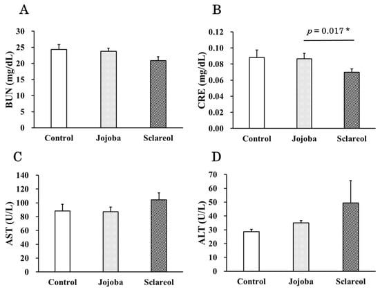 Plasma levels of (A) BUN, blood urea nitrogen; (B) CRE, creatinine; (C) AST, aspartate aminotransferase; (D) ALT, alanine aminotransferase; and (E) ALP, alkaline phosphatase. Control, naïve control group (n = 6); Jojoba, jojoba oil-administered group (n = 6); Sclareol, sclareol-administered group (n = 4). Values are presented as the means ± SEs. A one-way analysis of variance and Tukey’s post-hoc test were performed using the SPSS 24.0 statistical software package to compare the means of the three groups. * p < 0.05.