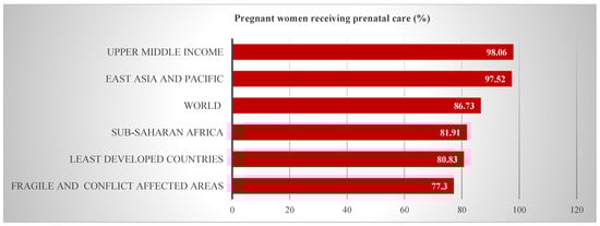 Figure 2 shows that sub-Saharan Africa’s percentage of pregnant women receiving prenatal care (81.91%) is below the world average (86.73%). The percentage of pregnant women in sub-Saharan Africa who receive prenatal care is comparable to that of least developed countries (80.83%). This shows that developing countries face challenges when it comes to prenatal care [41]. Despite the fact that 81% of women have at least one ANC consultation, many do not receive the entire range of evidence-based components during pregnancy [39,42]. However, it must be noted that, under normal circumstances, the World Health Organization (WHO) recommended that a pregnant woman should have at least four ANC visits [43,44]. African countries still fall short of this. Almost all women in high-income nations have at least four antenatal appointments, are attended by a professional health worker during labor and receive postpartum care. In 2015, 40% of pregnant women in low-income countries received the recommended prenatal care visits [42,45]. This shows that there is a substantial quality deficit in ANC facilities in sub-Saharan Africa.