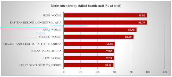 Figure 3 shows that in SSA only 59% of births were assisted by skilled health personnel in 2020 compared to 87% in the Arab world, 98% in high-income countries and 99% in Europe and Central Asia. Sub-Saharan Africa’s percentage is even lower than that of fragile and conflict-affected areas (60.65%). This shows that there is a substantial shortage of skilled health staff in sub-Saharan Africa. Darmian et al. [47] state that the main issue is that in most sub-Saharan African nations, coverage of deliveries attended by qualified health staff remains poor, despite the region accounting for 66% of global maternal fatalities. It should be underlined, however, that not having access to this critical support is harmful to women’s health and gender empowerment because it can result in the mother’s death or long-term impairment, particularly in marginalized areas.