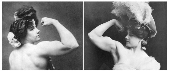 Interestingly, healthy females who compete in physique events attain low body fat levels and use resistance exercise training to increase skeletal muscle levels, displaying muscle and body fat proportions for their body weight approaching the proportions of male athletes [18]. This is not surprising when considering that higher levels of protein synthesis in skeletal muscle were found in women compared to men at young and older ages [19], and young and older women have the same muscle volume response from strength training as young and older men [20]. Figure 1 shows Charmion, a strongwoman from the late 19th century, before modern performance-enhancing drugs became popular.