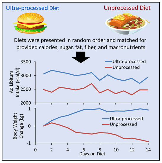 The popularity of ultra-processed foods that are high in fat, sugar, and salt coincides with the worldwide rise in obesity [49], and ultra-processed foods currently provide the majority of energy from calories, 57.9%, in the U.S. diet [50]. A 2019 randomized controlled trial sponsored by the U.S. National Institutes of Health provided twenty adults with three meals a day and snacks on a diet consisting entirely of either ultra-processed foods or unprocessed foods [51]. After two weeks, the participants switched diets for an additional two weeks. Each diet contained similar amounts of calories, macronutrients, fiber, sodium, and sugar, and participants were allowed to eat any amount of food they desired. Results showed that participants eating the ultra-processed diet consumed approximately 500 additional daily calories compared to those consuming the unprocessed diet, and participants on the ultra-processed diet gained an average of two pounds of body weight over two weeks. Weight gain was reversed when participants consumed the unprocessed diet, with losses of approximately two pounds of body weight over two weeks.