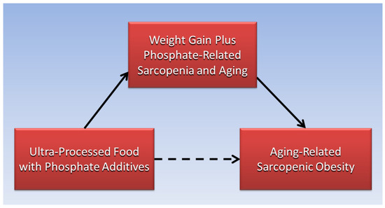 Finally, a mouse model of aging found that excessive amounts of dietary phosphates from the essential mineral phosphorus are associated with sarcopenia and other morphological changes in aging [54]. Further evidence links high serum phosphate levels with low muscle strength, or dynapenia, a condition used in the definition of frailty [55]. Moreover, sarcopenia is associated with aging-related impairment of mitochondria, which normally produce energy in muscle cells [56], and mitochondrial dysfunction is associated with accumulation of calcium phosphate [57]. Coincidently, phosphate additives are common in ultra-processed foods [58]. Accordingly, as illustrated in Figure 3, the present perspective paper proposes a causative pathway in which weight gain from ultra-processed food, combined with sarcopenia and aging from phosphate additives in ultra-processed food, increases risk of aging-related sarcopenic obesity. This etiological pathway can be integrated with individual, social, and environmental determinants of obesity to inform further research into the cause and prevention of aging-related sarcopenic obesity.