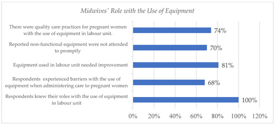 As depicted in Figure 3, 100% of respondents (57) knew their roles regarding the use of equipment in the labour unit, 68% (39) experienced barriers with the use of equipment when administering care to pregnant women, 81% (46) indicated that equipment used in the labour unit needed improvement, and 70% (40) indicated that reported non-functional equipment was not attended to promptly. However, 74% (42) indicated that there were quality care practices for pregnant women with the use of equipment in the labour unit.