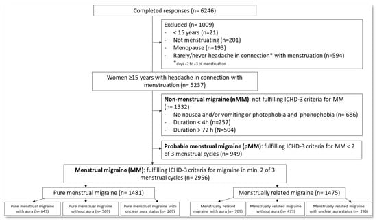 Recruitment from Instagram Stories appeared more effective than Facebook (6746 vs. 4507 clicks, respectively), resulting in 6246 women completing the survey in 12 days, corresponding to 55.6% of clicks resulting in a completed response. As described in Figure 1, after excluding individuals < 15 years of age, without menstruation, or without headache (n= 1009), 2956 women (47%) fulfilled the ICHD-3 criteria for MM (duration of headache/migraine lasting 4–71 h, while also experiencing accompanying symptoms such as nausea and/or vomiting, and/or photophobia and phonophobia, and having these symptoms in at least two out of three menstrual cycles. We did not, however, capture if they had had at least five attacks). There was an almost even split between those who had pure MM (occurring in at least two out of three menstrual cycles and at no other times of the cycle) (50.1%, n = 1481) and those who had MM related to menstruation (occurring in at least two out of three menstrual cycles, and additionally at other times of the cycle) (49.9%, n = 1475) []. In total, 2281 women did not fulfill the MM criteria, 1332 (21%) because of not fulfilling the ICHD-3-defined symptoms of migraine (non-menstrual migraine (nMM)), and 949 (15%) because they did not have migraine in at least two out of three menstrual cycles (probable menstrual migraine (pMM)).