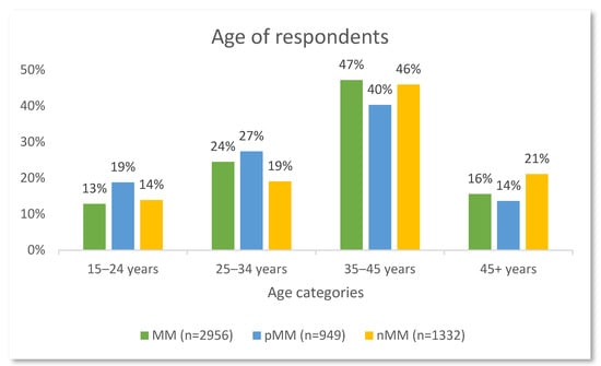Age categories of respondents fulfilling and not fulfilling ICHD-3 criteria for MM. MM: menstrual migraine; nMM: non-menstrual migraine; pMM: probable menstrual migraine.