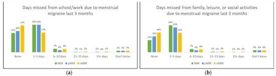 Utilizing questions from the MIDAS questionnaire, we asked about both burden of disease related to migraine, and then to menstrual migraine, and present findings from the latter. The women with MM appeared more burdened by their menstrual migraine than the women with pMM and nMM. Six out of ten (61%) with MM had missed out on school or work during the last 3 months due to MM; see Figure 3a. A total of 52% had missed 1–5 days, 7% missed 6–10 days, 1% missed 11–15 days, and 1% missed more than 15 days. Similarly, 69% had missed out on family, social, or leisure activities in the last three months due to MM, see Figure 3b; 60% had missed 1–5 days, 7% 6–10 days, 1% 11–15 days, and 1% +15 days. Overall, more women with pMM than nMM had missed out on both school/work and family, leisure, and social activities.