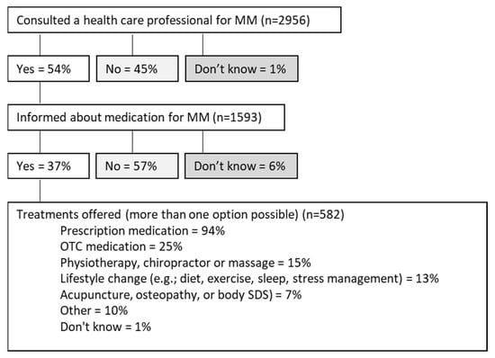 Among women with MM, 54% reported they had consulted a health-care professional (GP, neurologist, or an emergency room) regarding their MM; see Figure 4. Among those who did seek medical help, one in three (37%) had been informed about treatment to treat menstrual migraine. Almost all who were informed about treatment (94%) were offered or accepted prescription medication (e.g., birth control or medicine ending in ‘-triptan’), while 25% were offered or accepted OTC medication (e.g., paracetamol or ibuprofen). In comparison, 39% of women with pMM and 43% of women with nMM had consulted a health-care professional, 35% in each group had been informed about treatment options, and 97% and 90%, respectively, had been offered or accepted prescription medication.