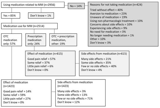 Among women with MM, 85% used medication in connection with MM, see Figure 5, among whom 57% used OTC medication only, 24% used prescription medication (unspecified) only, and 19% used either both or answered ‘other’. Among those who used OTC medication only, 73% had good or some pain relief and 16% had many or some adverse events. In comparison, 94% of those who used prescription medication had good or some pain relief, but 56% had many or some adverse events. Fourteen percent did not use medication for MM. The reported causes of not using medication included previous unsuccessful attempts (40%), aversion to medication (23%), lack of awareness regarding the possibility of using medication to manage migraine (19%), and 10% worried about adverse events due to medication. Among women with pMM, 78% used medication to treat MM; 66% used OTC medication only and 19% used prescription medication only. Among those who used OTC medication only, 80% had good or some pain relief, and 14% had many or some adverse events. Among those who used prescription medication only, 93% had good or some pain relief and 49% had many or some adverse events. Among women with nMM, 81% used medication to treat MM; 66% used OTC medication only and 21% used prescription medication only. Among those who used OTC medication only, 75% had good or some pain relief, and 16% had many or some adverse events. Among those who used prescription medication only, 93% had good or some pain relief and 53% had many or some adverse events.