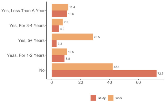 Figure 1 shows that a large majority of the participants did not continue studies (42.1%) and work (72.5%) after marriage. The percentage of participants who continued to work after marriage is comparatively higher than those who continued their studies. Only three percent of the participants studied for >5 years while about 29% worked for >5 years after marriage.