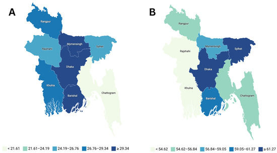 Figure 2 shows the percentage of women who continued to study (A) and work (B) after marriage. Chattogram has the lowest percentage of women who continued to study after marriage (19.03%), followed by Sylhet (26.48%) and Rajshahi (24.90%). In contrast, Barisal has the highest percentage (31.92%), followed by Dhaka (30.49%) and Mymensingh (30.57%). Dhaka has also the highest percentage of women who continued to work after marriage (63.48%) followed by Chattogram (54.65%) and Sylhet (61.34%). In contrast, Barisal has the lowest percentage at 59.23%, followed by Mymensingh (57.25%) and Rangpur (56.43%).