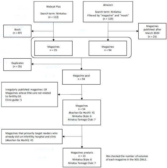 The flow diagram of the magazine selection is shown in Figure 1. To select publications for analysis, we used Webcat Plus (http://webcatplus.nii.ac.jp/ (accessed on 17 May 2020)), which is a service provided by the National Institute of Informatics, and Amazon (https://www.amazon.co.jp/ (accessed on 17 May 2020)), an online shopping service. Webcat Plus provides information on publications in an organized form by integrating various sources of information about publications held by 1000 university libraries nationwide and the National Diet Library. Amazon is a leading online shopping service in Japan and had more than 310 million active customers worldwide in 2017 [].