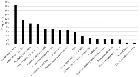Lifestyle factors specific to women such as hypersensitivity to cold (6.69%, 183 of 2737 codes), basal body temperature (2.96%, 81 of 2737 codes), and body deformation (1.06%, 29 of 2737 codes) were more frequently cited than lifestyle factors specific to men such as computer use (0.62%, 17 of 2737 codes) and scrotal heat (0.62%, 17 of 2737 codes).