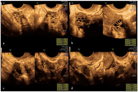 Transvaginal ultrasound evaluation of ovaries (a) Right ovary at presentation with AFC of 32 (b) Left ovary at presentation with AFC of 26. Total AFC count of 58 at presentation (c) Right ovary at follow-up with AFC of 3 (d) Left ovary at follow-up with AFC of 1. Total AFC count of 4 at follow-up. AFC: antral follicle count.