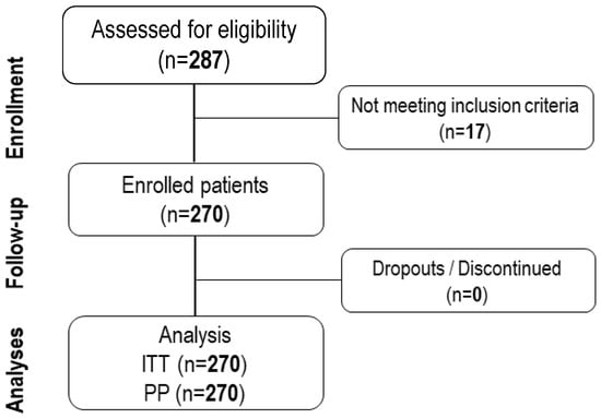 A total of two hundred and seventy patients (mean age 28.9 ± 8.8 years) were included. The study population was characterized by a previous history of daily activities limitation (63.0%), school or work absence (51.5%), and hospitalization due to PMS symptoms (2.2%) (Table 1). The CONSORT diagram represents the distribution in the study population (Figure 1).