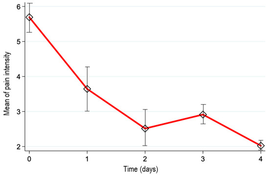 Pain intensity was measured by NRS and showed a reduction as follow: 3.6 ± 2.6 (day 1; n = 270), 2.5 ± 2.4 (day 2; n = 185), 2.9 ± 2.1 (day 3; n = 69), and 2.0 ± 2.3 (day 4; n = 44). The median difference in pain intensity (−4.5, 95%CI; −5, −4) demonstrated that the naproxen 220 mg + paracetamol 300 mg + pamabrom 25 mg tablet significantly reduced pain intensity through time (p < 0.001). Figure 2 shows the mean of pain intensity vs. time profile. In addition, we determined the proportion of patients who reported a pain reduction of at least 50% at the end of the treatment. This proportion was 70.7% (95%CI; 64.9%, 76.1%).
