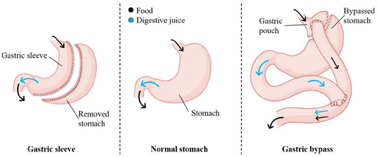 Comparison of stomachs and indicated direction in which the food is digested by the stomach (black) and the flow of the digestive juice (blue). (Left): Stomach after sleeve gastrectomy where ≥80% of the stomach is resected. (Middle): Stomach before bariatric surgery. (Right): Stomach after gastric bypass where the stomach is taken down right after the gastric inlet to create a gastric pouch so that the food bypasses a major part of the stomach.