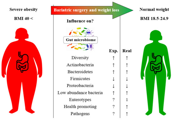Expectations (Exp.) of the influence of weight reduction from morbid obesity (BMI > 40 kg/m2) to normal weight (BMI 18.5–24.9 kg/m2) through bariatric surgery on the human gut microbiome and other factors are listed. In addition to the expectations, the correlations found in our study (real) are shown as far as information can be provided; in the case of the enterotype, there was a change to mostly type 1. ”?” denotes “unknown”, “↓” denotes “low” and “↑” denotes “high”.