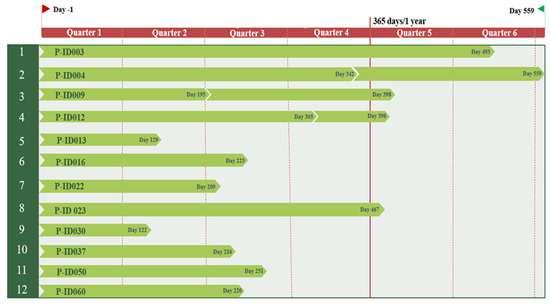 Timeline overview divided into quarters of all patients in this study including twelve patient-IDs (P-ID 003-060) and corresponding fecal sampling points. Day-1 describes the day prior to bariatric surgery for all patient samples. The shortest extraction point post-surgery was day 122 and the longest was day 559. In three patients, two stool samples were taken after surgery, whereby the respective last timepoints were included as post-operative in the following considerations.