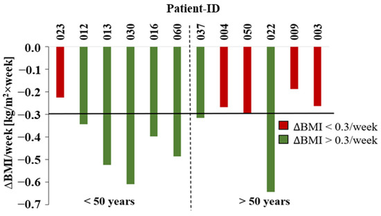 Changes in patient BMI (P-ID 003-060) per week ascending by age. Distinction between rapid decrease (∆BMI > 0.3/week; green) and slow decrease (∆BMI < 0.3/week; red). Shown are the clusters under 50 years and above.